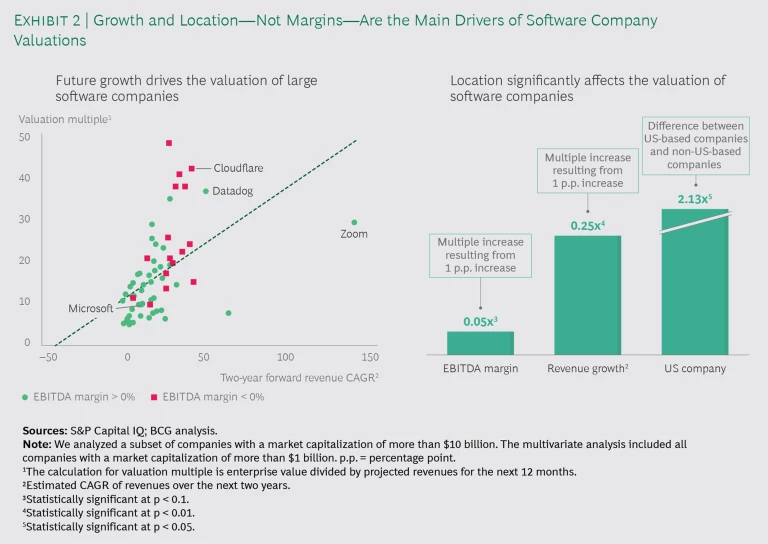 To understand what drives the valuation of software M&A transactions, we analyzed the valuation of a set of publicly traded software companies. We found that valuation multiples (measured as enterprise value divided by projected revenues for the next 12 months) strongly correlate with two factors: a positive growth outlook and a US headquarters. (See Exhibit 2.) Contrary to standard valuation theory, profitability does not explain valuation levels. Strikingly, even after controlling for profitability and growth, US companies have a statistically significant premium for the valuation multiple—approximately two times revenues.