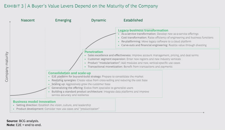 In our experience, the exact set of value levers, especially for nontech buyers, depends on the organization’s maturity with regard to software capabilities. (See Exhibit 3.) First-time buyers of software assets primarily create value through business model innovation and, potentially, new products. More mature companies are most likely focused on consolidating the market and scaling up their business by acquiring assets along different steps of the value chain. Buyers with the highest maturity deploy the new software capabilities throughout the whole organization, thereby increasing the penetration of new technology in the company and transforming their legacy business.
