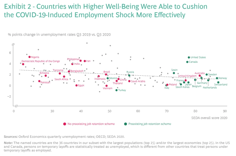 In terms of employment, we saw a similar effect. Countries that had high SEDA scores were better able to cushion the blow of COVID-19 and limit the growth of unemployment. (See Exhibit 2.) Many of these countries already had measures in place to increase the resilience of labor markets—such as unemployment safety nets and job retention schemes. Even in cases where the labor market policies needed to be adjusted, doing so was a faster process than creating them from scratch. A stubborn question remains as to whether retention schemes will lead to a stronger labor recovery once the pandemic ends; to some extent, that depends on whether they support jobs that have been temporarily at risk but are still viable in the long term.
