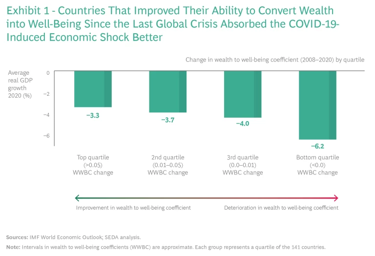 In terms of economic growth, countries which improved their ability to convert wealth into well-being since the global financial crisis, saw a smaller drop in their real GDP growth rate in 2020, while countries that have experienced a deterioration in their ability to convert wealth into well-being saw a correspondingly larger drop. (See Exhibit 1.) This reveals that investing in well-being enhances long term resilience and can further enhance a nation’s ability to withstand future crises. Notably, the countries that experienced the biggest drop in GDP also underperformed significantly in SEDA measurements of governance and civil society, suggesting that these are key dimensions in fighting the pandemic’s economic repercussions. Governance is critical because it boosts transparency and accountability, leading to greater public trust in government and increasing participation and engagement of citizens. Civil society matters because it helps countries deal with the unequal fallout from a crisis—for example, providing support and aid to those who are disproportionately affected.