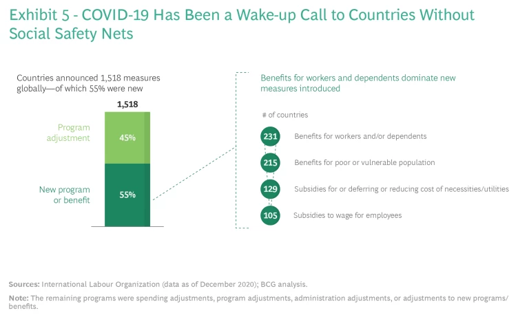 Social protection systems can dramatically mitigate the impact of crises like COVID-19, particularly for vulnerable populations who have been disproportionally impacted. Since the beginning of the pandemic, the number and scope of social protection initiatives has been unprecedented. Overall, as of December 2020, approximately $590 billion (or nearly 1% of worldwide GDP) had been pledged toward more than 1,500 specific measures in 209 countries. More than half of these were for new programs or benefits. (See Exhibit 5.) Many countries prioritized benefits for workers and their dependents along with benefits for poor or vulnerable populations.