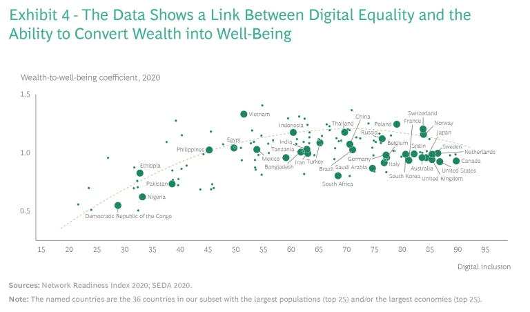 - Bridge the digital divide. As evidenced by those who have been disproportionately affected by school closures and the move to telework and telehealth, digital inequality tends to exacerbate existing social inequality. At the foundational level, countries need to ensure the provision of universal, reliable, and stable connection to the internet. Equally critical to safeguarding connectivity is bridging the access gap. COVID-19 has exposed the hardware divide, in which availability of devices (smartphones, PCs, laptops, tablets) and peripheral services (apps and subscriptions) dictates the extent to which people are able to leverage critical digital services such as e-learning. Furthermore, digital inclusion policies need to be multidimensional—promoting digital literacy, enhancing technological competence, and fostering the effective use of technologies to promote fruitful participation in the digital economy. As Exhibit 4 shows, there is a correlation between a country’s digital inclusion performance (as measured by the Network Readiness Index) and how well it converts wealth into well-being.