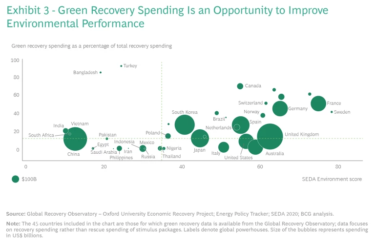 Indeed, some nations are intensifying their investments in environmental well-being. While countries that are already leading in SEDA environmental performance tend to be doubling down on a green recovery, other countries that are not environmental frontrunners have also passed recovery packages with a substantial share of investments targeted at environmental objectives. (See Exhibit 3.) This suggests that these countries see the crisis as an opportunity to accelerate their sustainability efforts.
