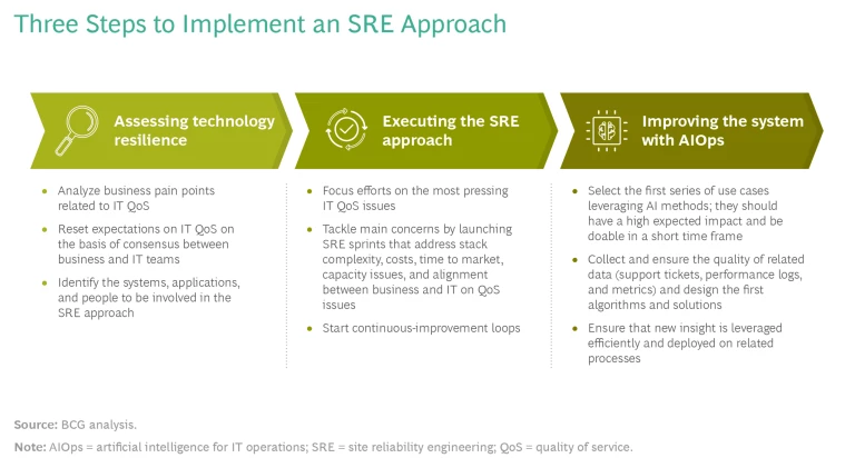 Clearly, the SRE approach has many more benefits than traditional IT processes. Nevertheless, adopting it as a framework for the IT operations of the future can be daunting. BCG believes that adoption can be simplified by separating implementation into three individual facets of an overall journey: assessing technology resilience, executing the SRE approach, and improving the system with AIOps. (See the exhibit.)