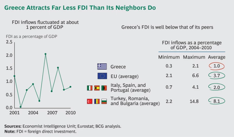 According to research conducted by The Boston Consulting Group, Greece must attract approximately €36 billion in FDI to help fuel its recovery. An FDI strategy that targets both privatization and new “greenfield” investments in key sectors could produce as much as a 1.5 percent increase in GDP. Sectors with traditionally limited FDI penetration—such as tourism, transportation, utilities, construction, and health care—present opportunities for potentially high returns.