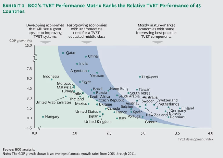 Because education systems are strongly correlated with the level of economic development within a given country, we plotted the countries’ TVET performance against GDP growth over the past six years. (See Exhibit 1.) This broke our universe of 45 countries into three clear bands: