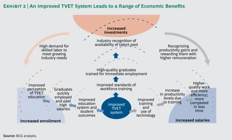 A good TVET system would trigger a ripple effect in the national economy. First, it would improve the perception of TVET and, correspondingly, increase the employability of—and demand for—TVET graduates. This would increase the enrollment in TVET schools. Next, the availability of high-quality, skilled workers would increase investment in the economy by both industry and government. Finally, the increased skill levels would enhance productivity, competitiveness, and efficiency, resulting in positive returns for employers and increased salaries for employees. (See Exhibit 2.)