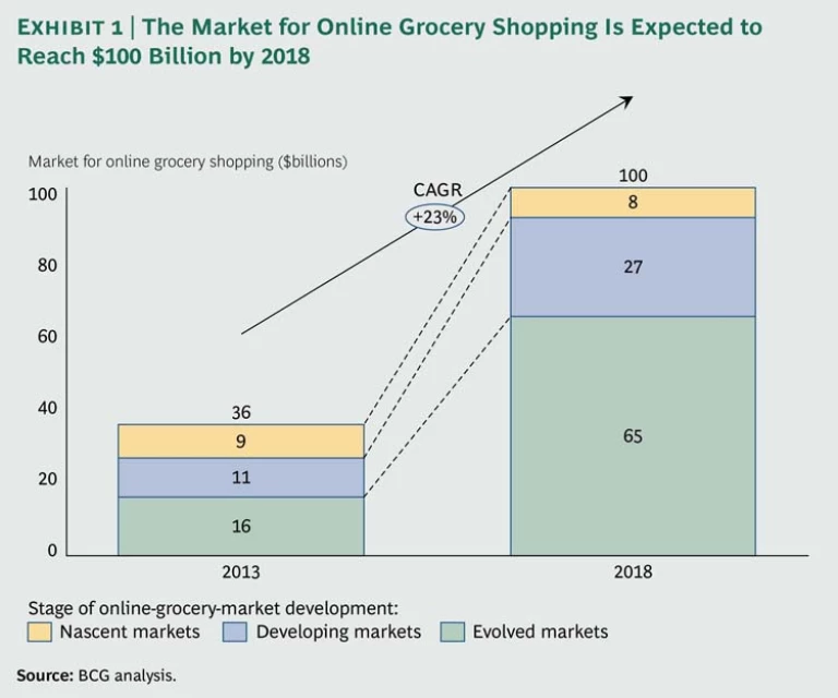 We believe that the prevailing doubtful view is about to hit its expiration date. We expect the global online grocery market to reach $100 billion by 2018. (See Exhibit 1.) Based on new consumer research in eight countries, as well as on our experience with leading companies around the world, we also believe that establishing profitable online grocery operations is not only possible, it is essential for those that want to continue to grow and maintain market