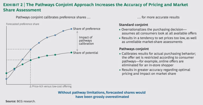 Providers need a more accurate method for pricing plans. To that end, BCG has developed a new methodology, one that doesn’t replace conjoint analysis but rather calibrates the results to reflect actual purchasing behavior. It does this by identifying and factoring in the different “pathways” consumers take when they consider “real” offers. By understanding these pathways, providers home in not only on the most favorable price levels but also on the features and services that customers, in fact, want most.