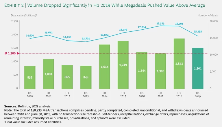 In the first half of 2019, M&A value stabilized near the long-term average. However, some alarming trends persisted. M&A volume dropped to 15,400 deals, approximately 3,000 fewer than in the first half of 2018—possibly indicating an end to the current M&A cycle. (See Exhibit 2.)