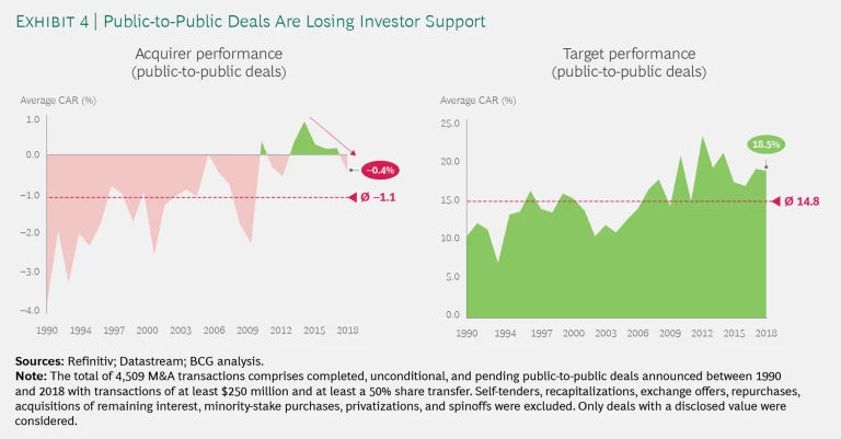 The shift in investor sentiment toward acquirers is attributable to several factors. With concerns mounting that a downturn may be near, shareholders are losing their appetite for risk and are scrutinizing more carefully an acquisition’s potential to create value. This is consistent with our finding in the 2018 M&A Report that investors have become more skeptical about buyers’ ability to deliver on the bold promises in their synergy announcements.