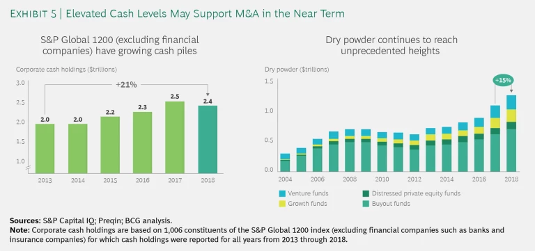 High cash levels drive demand. Elevated levels of cash holdings, for both corporations and PE firms, will continue to support dealmaking in the near term. Among the S&P Global 1200 (excluding financial institutions and insurance companies), cash holdings totaled $2.4 trillion in 2018, down slightly from 2017 but still 21% above the level in 2013. Over the medium term, the fact that corporate cash holdings appear to have peaked may mean that some companies will choose to forgo M&A activity and instead hold onto their cash in anticipation of an economic downturn. Among PE firms, reserves of dry powder increased by 15%, up by a staggering 74% since 2013 and continuing the streak of annual records. (See Exhibit 5.)