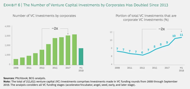 Industry convergence and the rise of ecosystems encourage unconventional deals. The absolute number of venture capital (VC) investments by corporate investors and the relative share in all VC investments (by volume) has doubled since 2013. (See Exhibit 6.) Increasingly, the objective of deals is not to take control of a company but rather to gain access to specific capabilities, talent, or technology or to establish partnerships. Two related developments are promoting the shift in emphasis.