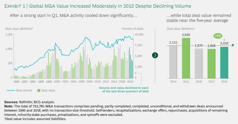 Taken as a whole, 2018 continued the streak of good years for M&A activity dating back to 2014. Global M&A value increased by about 7%, which is close to the five-year average. Deal volume declined slightly (by 3%), with about 35,800 deals announced during the year. (See Exhibit 1.)