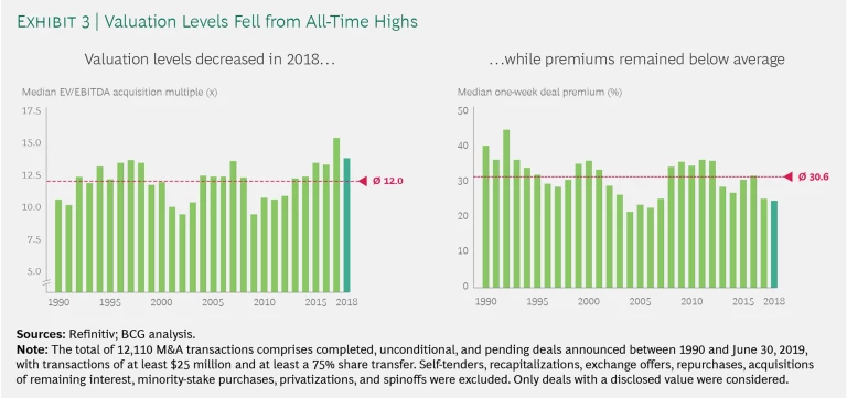 In terms of valuation, deal multiples—enterprise value divided by EBITDA—declined slightly in 2018, to a median of 13.7x. In the first half of 2019, multiples declined further to 13x. That is lower than the all-time high of 15x set in 2017 but still above the long-term average of 12x. The continued decline in the first half of 2019 was driven, in part, by decreasing multiples in cyclical industries, such as industrial companies and consumer-related businesses. However, the average multiple paid for high-tech companies increased significantly. Acquisition premiums, on average, held steady (24.1% in 2018 versus 24.6% in 2017). In the first half of 2019, they rose to 31.2%—slightly above the long-term average of 30.6%. (See Exhibit 3.)