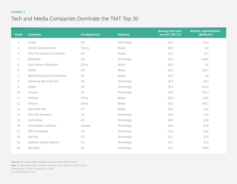 - Tech companies, such as Amazon, Google, and Microsoft, are providing the cloud infrastructure that powers the data and analytics revolution. They are also allowing others to create new business models around AI. For example, number-one TMT value creator, Nvidia, has launched its Drive Constellation project to improve the testing of autonomous vehicles through AI-enabled simulation of actual driving conditions. (Nvidia also ranks 9th on our list of value creators across all industries, out of more than 2,200 companies in the overall sample.)