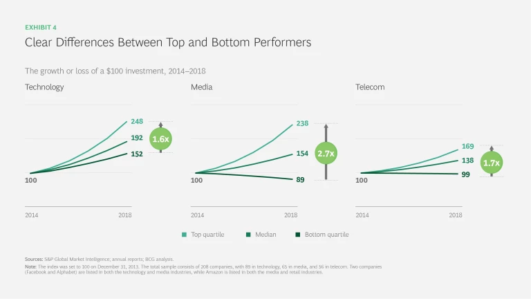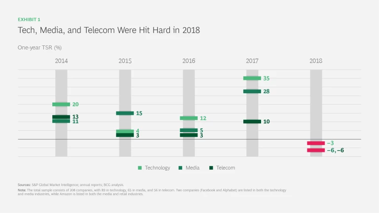 Total shareholder returns in the sector reflect this turbulence and decline. For the five-year period covered in BCG’s 2014−2018 TMT value creators study, the median annual shareholder return of these companies was 9.9%—almost half that of the prior five-year period (2013–2017), at 18.1%. The one-year performance for each of the three industries in 2018 was negative. (See Exhibit 1.)