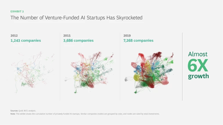 Advances in machine vision and natural language processing now allow machines to expand into activities commonly performed by humans, such as those involving speech and vision, while exponential advances in computing power are opening up new uses for AI. (See “Competing in the Age of Artificial Intelligence,” BCG article, January 2017.) A technology that has already gone through several boom-and-bust cycles over the past several decades, AI is certainly booming—and may even be experiencing a bubble—in the venture market. The number of venture-funded AI startups has increased almost sixfold since 2012. (See Exhibit 3.)