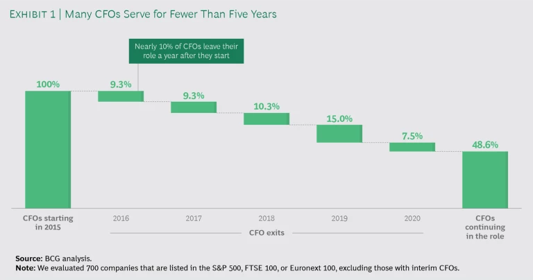 The scope of the challenges appears to be taking a toll on the tenure of some CFOs. A BCG analysis found that nearly 10% of CFOs at top companies leave their role within a year after they start the job. And more than 50% have left by the end of the fifth year. (See Exhibit 1.) A brief tenure does not give a CFO enough time to fully understand the company or its industry and the trends affecting them. As a result, the CFO is not able to have a meaningful impact on the organization and leave behind the desired legacy.