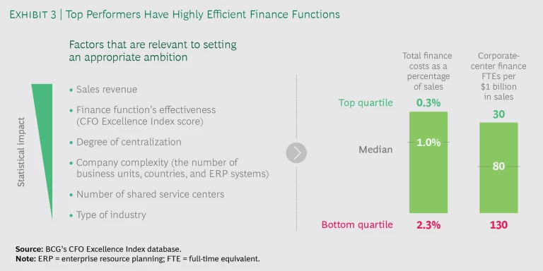 CFOs should also compare the finance function with its peers on the basis of head count and costs. This benchmarking can reveal departments or areas that are currently lagging in cost-effectiveness. Analyzing the database for BCG’s CFO Excellence Index, we find that best-in-class finance functions’ total costs are consistently in the range of 0.3% to 1.0% of sales. (See Exhibit 3.)