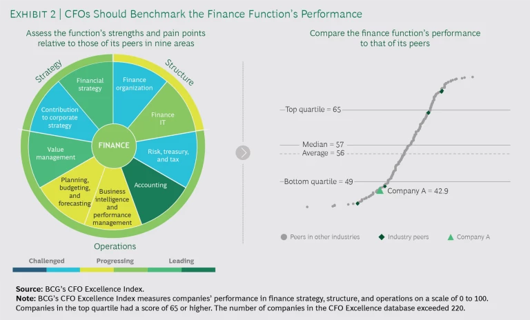 CFOs should measure the finance function’s performance against that of its peers. (We define peers as finance functions in companies of a similar size and complexity.) For example, BCG’s CFO Excellence Index assesses a finance function’s performance relative to that of its peers in its own industry and in others across nine areas. (See Exhibit 2.) This assessment helps to identify the challenges and sources of competitive advantage. By highlighting gaps between the finance function’s current performance and that of its peers, some of which may rank in the top quartile, the analysis reveals potential improvement opportunities.