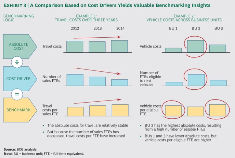 For example, simply comparing a sales organization’s travel costs over several years would not yield useful insights. The high-level, absolute cost figures could vary for numerous reasons, such as head count and the frequency of travel by employees in a given region or role. In contrast, gathering data on the number of sales full-time equivalents, the number of trips per year, and the costs of each trip allows the company to determine the true drivers of variations among travel costs. It may find, for instance, that despite stable absolute travel costs over time, costs per sales FTE have actually increased. (See Exhibit 3.) Similarly, rather than comparing absolute figures for costs of company vehicles among business units, companies should consider the number of FTEs eligible to rent vehicles and the cost per rented vehicle per eligible FTE.