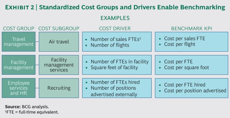 To facilitate this effort, BCG has developed a standardized list that sets out cost groups and subgroups, as well as their respective cost drivers. Exhibit 2 illustrates this breakdown for several cost groups. The standardized list can be applied to all business units and companies, and thereby provides the basis for internal and external benchmarking. A company can customize its terminology for each cost group and subgroup to reflect company-specific names and cost allocations; however, its categories must correspond in substance to those on the standardized list in order to permit a like-to-like benchmarking.