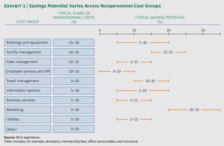 In addition to their high savings potential, measures to control nonpersonnel costs can often be implemented quickly and with relatively low up-front investments (for example, by changing travel guidelines). Consequently, companies can see the bottom-line impact faster than when reducing personnel costs. And, in contrast to cost cutting in other areas, most employees will not even notice reductions in some types of nonpersonnel costs, such as facility rents or utility rates.