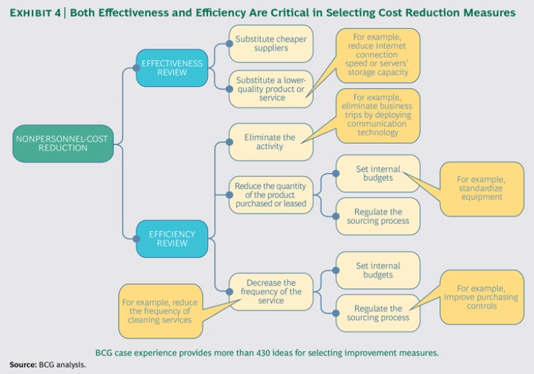 With this fact base in hand, companies can determine the improvement measures for each cost group and subgroup. BCG’s approach to determining appropriate measures entails reviewing both the effectiveness and efficiency of the related expense items. (See Exhibit 4.)
