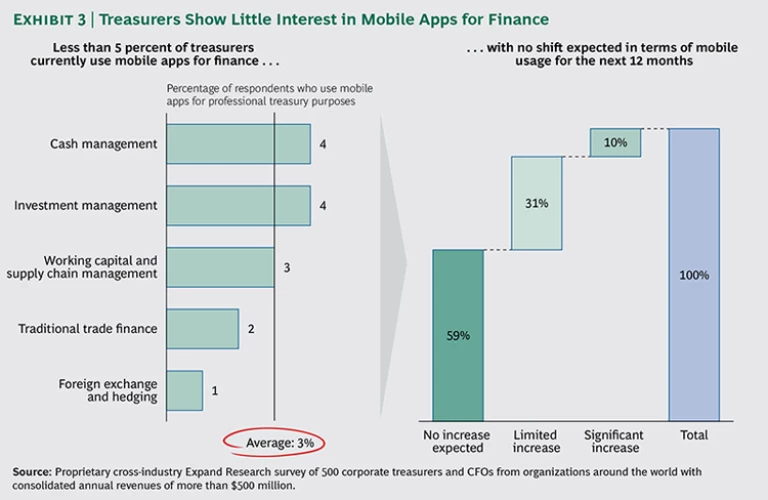 Limited Interest in Mobile Execution. Treasurers expressed little interest in mobile use for professional finance purposes: less than 5 percent of treasurers currently use mobile applications in that capacity. When asked why, many treasurers said they have little need for out-of-desk execution. They also worry about security, and they view current mobile offerings as relatively weak. We believe corporate treasurers are likely to remain on the sidelines in the coming months when it comes to mobile applications for professional finance: 60 percent stated that they do not plan to increase their usage and only 10 percent plan to increase their use significantly. That said, treasurers do see value in some baseline functionalities, such as the ability to receive alerts and to authorize transactions over mobile devices. (See Exhibit 3.)