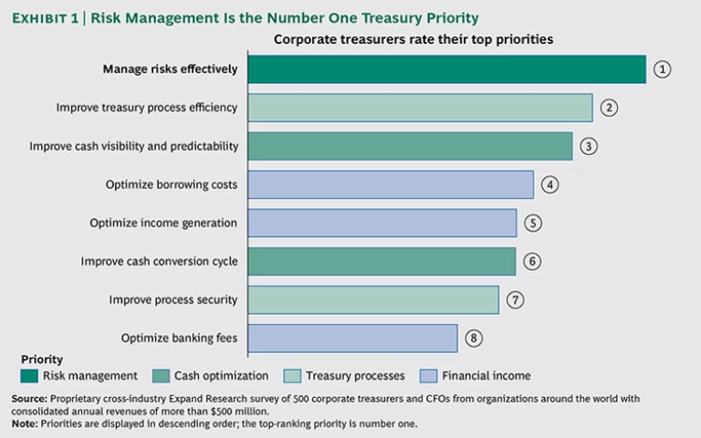 The heightened risk climate of the post-financial-crisis period means that senior management is paying much closer attention to treasury activities and liquidity management. Treasurers who participated in our survey reflected that heightened interest by ranking effective risk management as their number-one priority, followed by increasing process efficiency and improving cash visibility and predictability. As one treasurer stated, “My priority is to manage our day-to-day risks and advise senior management on the strategic decisions required to tackle them.” Survey results found treasurers negotiating a careful balancing act: how to put treasury risk management at the forefront—especially in light of growing fraud and security concerns—without disrupting cash optimization and cost reduction efforts. (See Exhibit 1.)