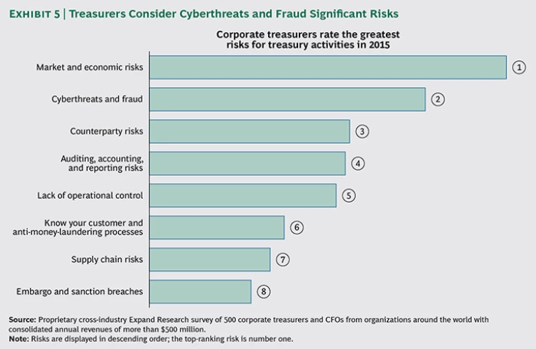 Risk Management and Compliance: High Expectations. After market and economic risks, treasurers are most concerned about cybersecurity threats and fraud. Banks are well positioned to help treasurers address these key risks by providing advanced risk-management tools, such as credit risk assessments, proprietary perspectives, and advisory offerings that help treasurers with long-term financial investments. Of those surveyed, 70 percent said banks that offer strong fraud-detection capabilities would have a competitive edge. (See Exhibit 5.)