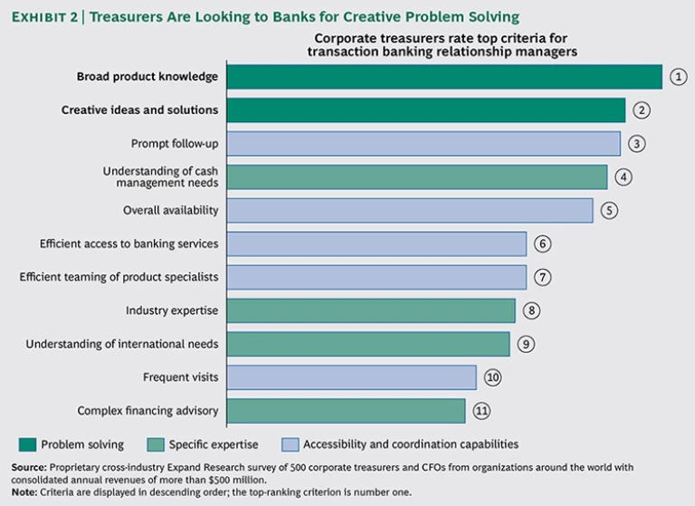 In response, banks need to adopt a day-to-day problem-solving posture across their servicing organization. The relationship manager role must evolve into that of a trusted advisor and problem solver—someone with broad product knowledge and innovative ideas for dealing with challenges. Treasurers ranked “creative ideas and solutions” as the second most important criterion for selecting a relationship manager—ahead of such attributes as complex financing-advisory skills, industry expertise, or overall availability. (See Exhibit 2.)
