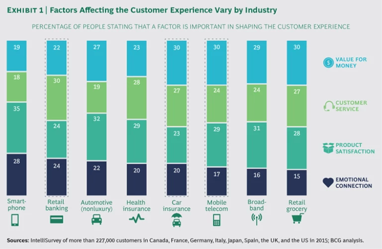 In addition to assessing how advocacy fuels growth, we have identified the precise rational and emotional factors that shape the customer experience: value for money, customer service, product satisfaction, and emotional connection. The mix of the four factors varies by company and industry, but in industries that involve ongoing interaction between consumers and companies (as opposed to the simple purchase and use or consumption of a product), the customer service component ranks high in importance; between 24% and 30% of customers in retail banking, car insurance, and telecommunications, for example, consider it important. (See Exhibit 1.)