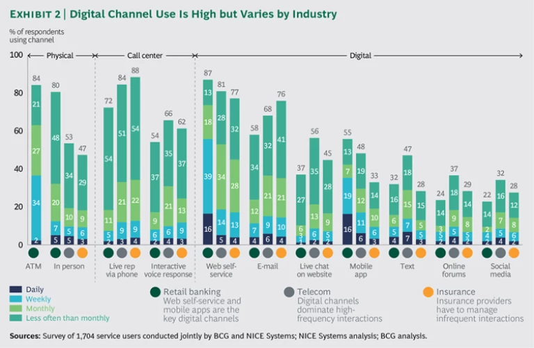 Across the three industries we surveyed, large majorities of customers use digital channels. (See Exhibit 2.) In some industries, digital pathways have become more important than voice—presenting companies with an important opportunity given the low cost of managing digital interactions (once they get them right). In retail banking, for example, Web-based self-service has surpassed both in-person contact and the call center as the most-used service option. Of the 87% of respondents who use banks’ Web self-service offerings, 64% use them at least once a week. Customers appreciate the 24-7 availability and easy-to-use interfaces of online self-service.