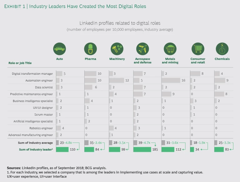 We found that, across industries, companies on average employ very few people in digital roles. For each industry, we selected a leading company in implementing use cases at scale and capturing value. The industry leader in each case has significantly more people in digital roles than the industry average—an indication of its commitment to invest heavily in a digital operations program. (See Exhibit 1.) We found digital roles most prevalent, on average, in the aerospace and defense (A&D) and pharmaceuticals industries. A&D’s leadership reflects the industry’s historical investments in lean management and Industry 4.0 initiatives. Pharma’s strength in data science and BI highlights the industry’s historical focus on R&D and sales.