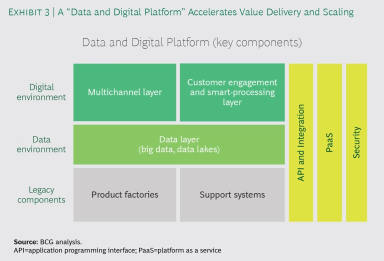 A DDP supports scale in several ways. (See Exhibit 3.) The platform decouples the data environment from legacy systems, facilitating data sharing and usage. Data lakes and modern data technologies ensure that companies can take in and store large amounts of structured and unstructured data and process it in real time. A cloud-native platform delivers ubiquitous access to data. The DDP also provides an environment for developing digital, analytics, and data products faster (via “devops” and “dataops” capabilities). Additionally, by providing an interface among digital services, digitized processes, and the Internet of Things, the platform fosters an integrated approach in how companies use them. Application programming interfaces and microservices (which focus on specific pain points) increase the modularity of applications. The platform can be built using a non-proprietary or commercial “platform as a service” (PaaS).