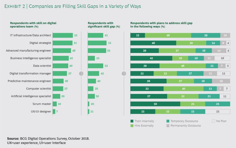 Additional analysis of LinkedIn job postings by manufacturing companies found that demand is highest for data scientists and BI and AI specialists. However, our survey found a shortfall with respect to other technical talent, as well. About 50% of survey respondents indicated they didn’t have enough advanced manufacturing engineers, AI specialists, data scientists, and digital strategists. To address near-term talent gaps and overcome the shortfall, digital leaders are using strategies such as training internally, hiring externally, and outsourcing on a permanent or temporary basis. (See Exhibit 2.)
