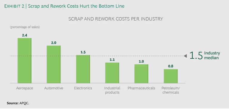 Additionally, costs related to production inefficiencies, increased downtime, and rejected products have a substantial impact on profitability across industries. In the automotive and aerospace industries, for instance, the costs of scrap and rework represent approximately 2% of sales. (See Exhibit 2.)
