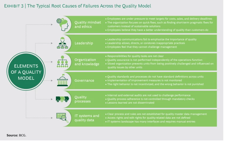 - Health Check. To understand quality mindsets and challenges, the company can conduct interviews (known as “beliefs audits”) with 10 to 20 senior managers. It can also use a quality maturity assessment to gain insights into the current state of its quality system. An additional in-depth analysis is required to identify the root causes of quality problems. In our work with companies in a variety of industries, we have identified typical root causes of poor performance across the elements of the quality model. (See Exhibit 3.)