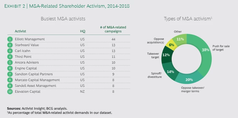 Several other aspects of our research are worth highlighting. First, while activist-related M&A is on the rise, it still makes up only a small share of the overall dealmaking landscape. Of the more than 170,000 M&A deals announced during the five years of our study period (2014 through 2018), just 900 were based on activist demands. In addition, not all demands are met by the target company; in the group we studied, only 34% of demands were successful and 34% are still ongoing, meaning that 32% were unsuccessful. A related phenomenon is that the mere presence of activists may push some executives to proactively pursue an M&A agenda to avoid becoming a campaign target. Those situations are not reflected in our research, suggesting that the actual impact of activists could be higher than our data shows.