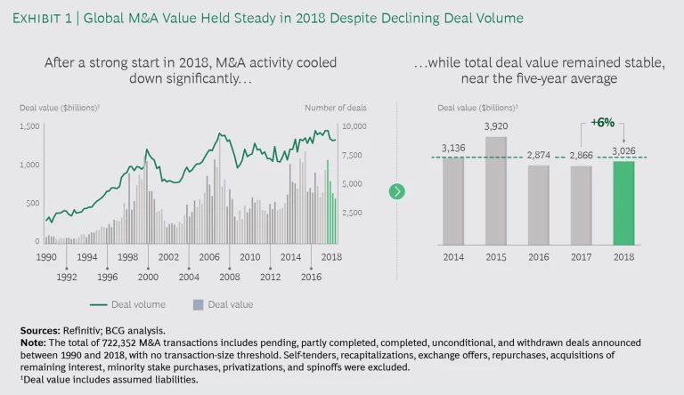 In 2018, M&A activity was stable compared with that in previous years. Global M&A value increased by about 6% in 2018, and deal volume declined by 4%, with about 35,500 deals announced during the year. (See Exhibit 1.)