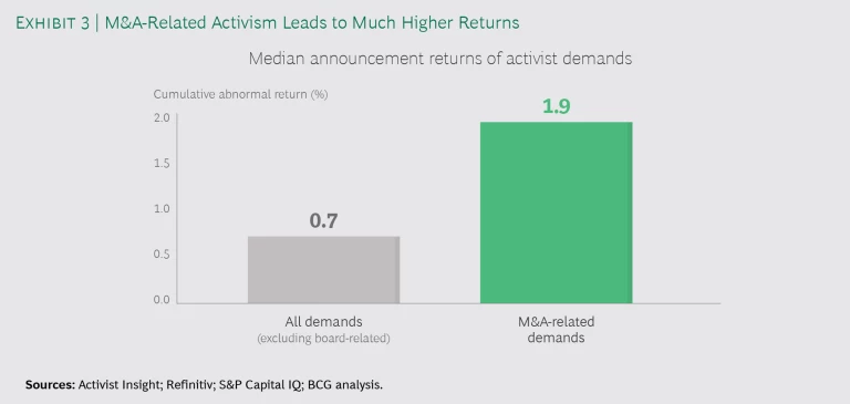 Our research supports this perception. We looked at the cumulative abnormal return (CAR)—a measure of the target’s total return for the six-day period surrounding the deal announcement (three days before and three days after), compared with the overall return for the target’s industry. For M&A-related demands based on shareholder activists, the median CAR around the announcement date is +1.9%. That is nearly three times the CAR for activist demands that were not related to M&A (+0.7%). (See Exhibit 3.)