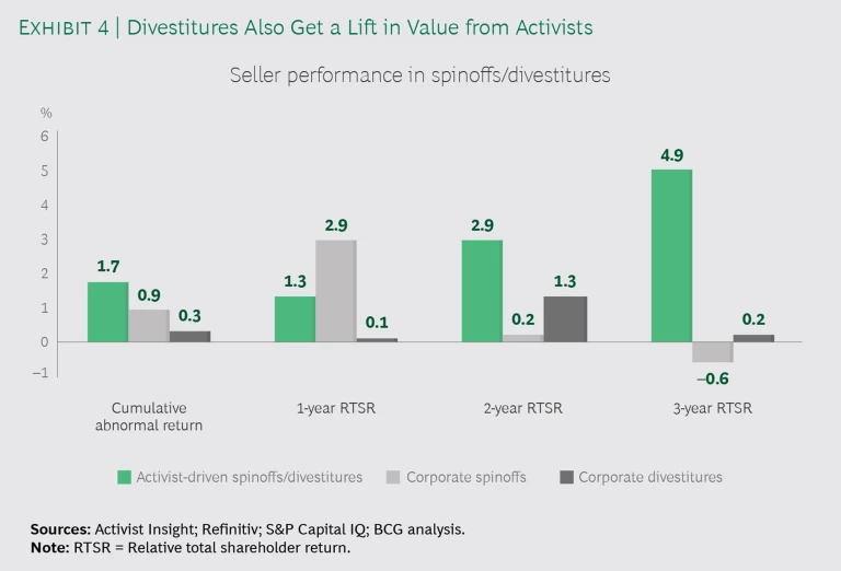 Drilling down, we also looked at the market reaction to activist demands for spinoffs and divestitures. These seem to create additional value not only in the short term (supported by a CAR of +1.7%) but also in the longer term, with a positive total shareholder return relative to the industry benchmark (RTSR). When comparing these gains with the seller returns of spinoffs and corporate divestitures in general, the spinoffs and divestitures demanded by activists outperform significantly. (See Exhibit 4.)