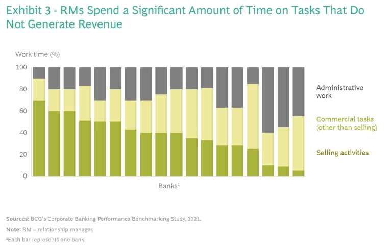 Other counterproductive commercial-banking habits include operating with a one-size-fits-all credit process, having RMs monitor simple credit cases at length, and allowing an RM’s time to be highly fragmented across various sales and relationship management activities. For example, RMs in US commercial banks often can spend up to 60% of their time on internally facing administrative tasks. (See Exhibit 3.) Activities such as assembling information from different sources of data, or keeping up with administrative reminders, have little to no impact on client satisfaction or revenue generation. With more and more clients to manage, and more data available for analysis, it’s more important than ever that sales teams receive the most relevant, up-to-date information on their clients as seamlessly and automatically as possible.