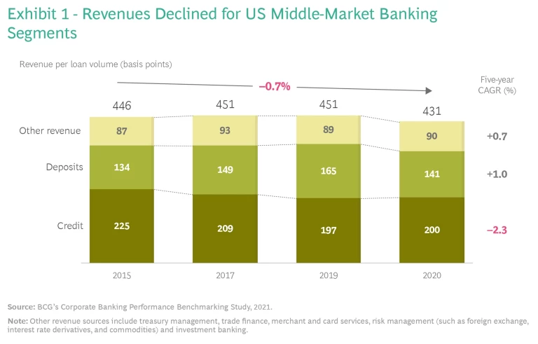There are several different sources of pressure. One is general economic uncertainty, exacerbated by the pandemic. For example, the current low interest-rate environment and the low demand for loans is constraining the financial services industry, most notably in the US. Revenues in core US commercial-banking middle-market segments ultimately declined from 2015 through 2020 by about 4% in five-year CAGR each year. (See Exhibit 1.) While revenue from fee-based cross-selling has grown by as much as 1% per year, it is largely offset by the effect of compressed loan margins, which are responsible for up to 2% annual reductions in CAGR. And there has been barely any growth from noncredit products, such as deposits, treasury management, trade finance, merchant and card services, risk management, and investment banking.