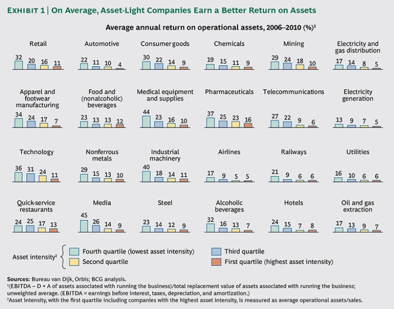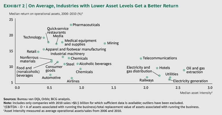 But focusing on individual examples obscures a deeper truth. We analyzed 2,687 of the largest companies—across 24 industry sectors—that publish financial results. Our analysis revealed that on certain measures, the more asset-light companies on average earned greater returns on assets than their peers did. (See Exhibit 1.) This finding also holds across industries. Industries that have lower levels of assets generate a better return on the assets they hold. (See Exhibit 2.)