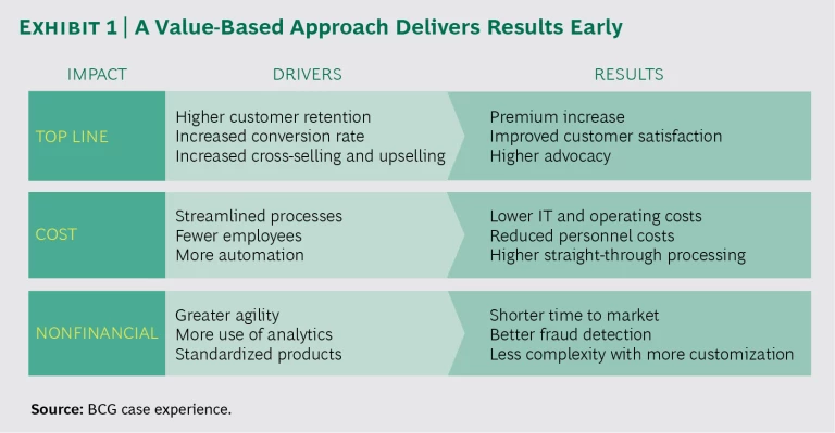 We believe that if a transformation is to succeed, it must show value for customers quickly—by offering new services that help customers make the right decisions about their plans, for example, or by introducing new loyalty programs that facilitate collection of customer information. A company can measure gains in value in several ways, including increased cross-sales and higher retention or conversion rates that lead to better customer satisfaction and more advocacy. Improved efficiency and lower costs in an insurer’s operations or distribution resulting from more-effective process automation are additional measures of success. Revenue boosts and cost reductions in the early days can help fund the journey at a stage when investments are typically bigger than benefits. (See Exhibit 1.)