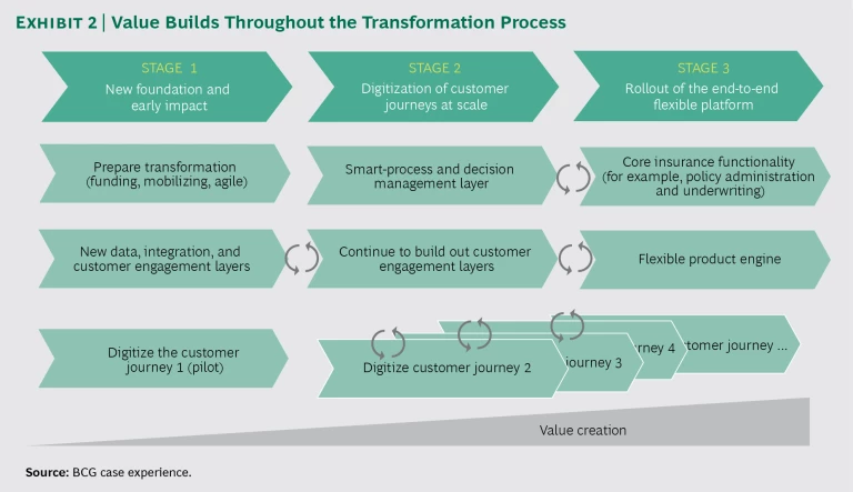 According to the old saying, getting there is half the fun. Most company leaders might disagree, but they would agree that it’s half the challenge, if not more. Insurers that adopt a phased approach to the transformation of their business and technology will find that getting there can be a manageable (and exciting) process—and one that delivers results and value all along the journey.