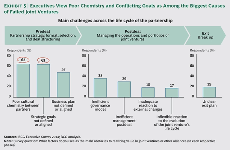 The other key enabler centers on partnerships and joint ventures, which many companies will find are key elements in their strategy mix. A recent BCG study on mergers and acquisitions revealed that the vast majority of executives are disappointed by the performance of their cross-border joint ventures. (See Getting More Value from Joint Ventures, BCG Focus, December 2014). The analysis identified several critical measures that can help avoid such disappointment. (See Exhibit 5.) They include ensuring that there is cultural chemistry between partners and that there is alignment on strategic goals and business plans, including a clear process for when business plans are not met along the way. Other measures are a sound governance model and an exit plan.